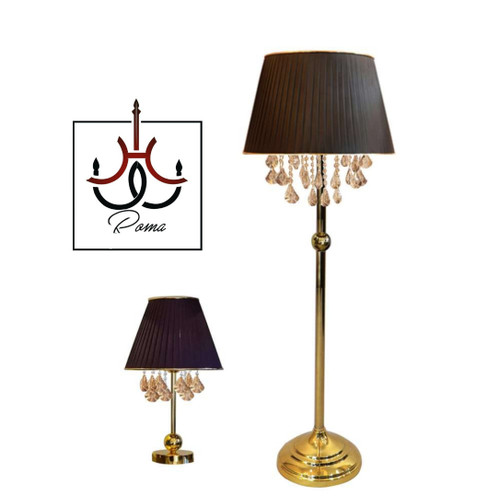 آباژور ایستاده و رومیزی افروز | ست کامل طلایی با آویز کریستال | برند رومالوستر