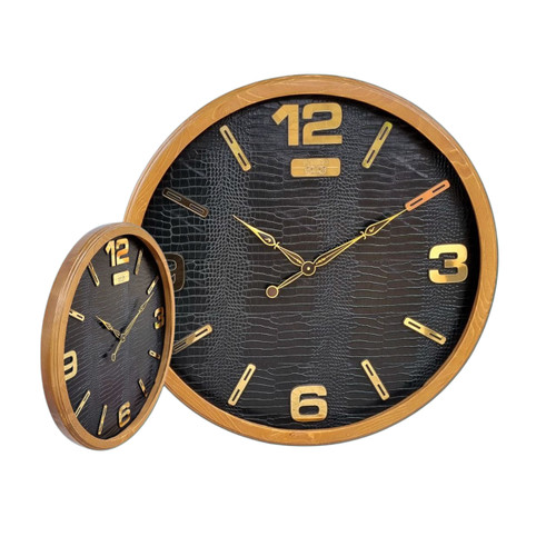 ساعت دیواری دایره‌ای چوبی با صفحه چرم مشکی – کد 7501