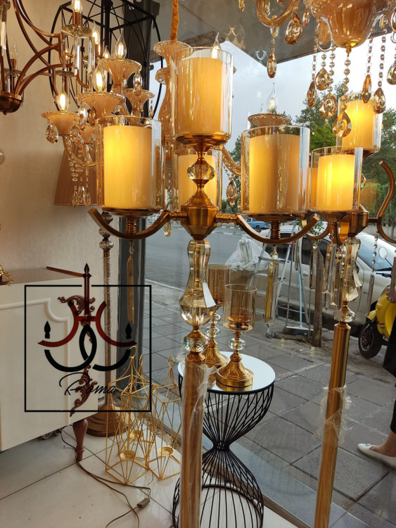 آباژور مدرن کنار سالنی ایستاده طلایی نمونه تولید لوسترروما با متریال اورجینال درجه یک