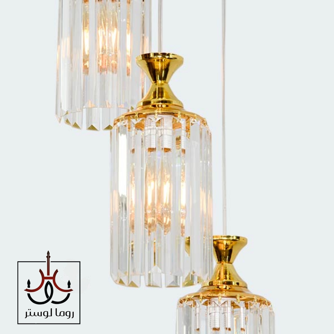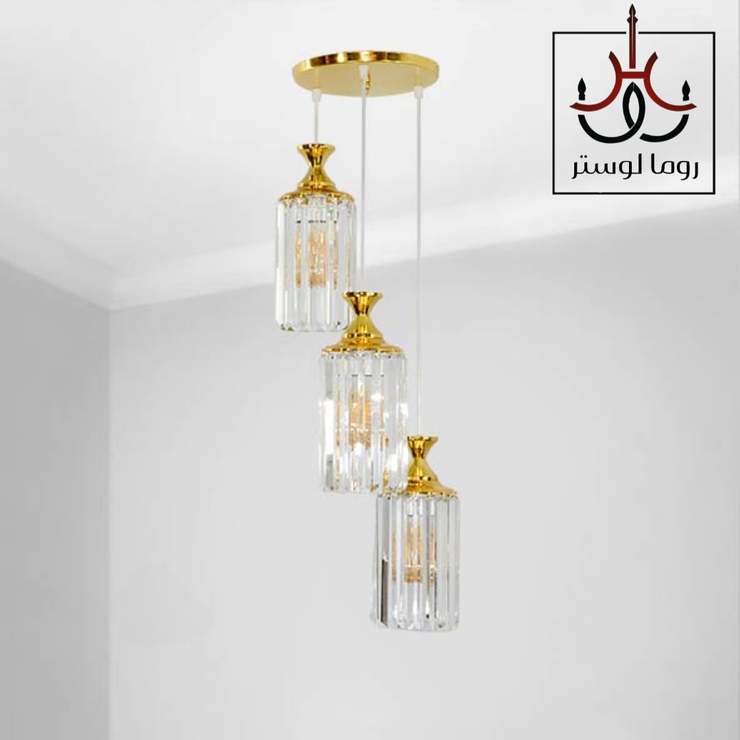 لوستر آویز سه شعله کریستالی برند رومالوستر رنگ طلایی مناسب آشپزخانه و اتاق خواب